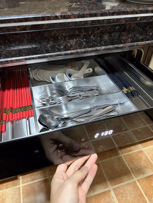 三层分类很好,空间大,可以放好多碗,做工质量不错。加热消毒时橱柜四周没有很热。