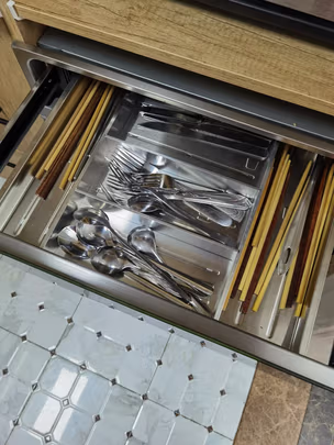 整体设计非常合理,空间也非常的大,有三层,每层都可以容纳很多东西,上层可以放勺子、筷子、刀叉,中下层可以放置碗碟盘,内里的用料也十分给力!推荐!!!
