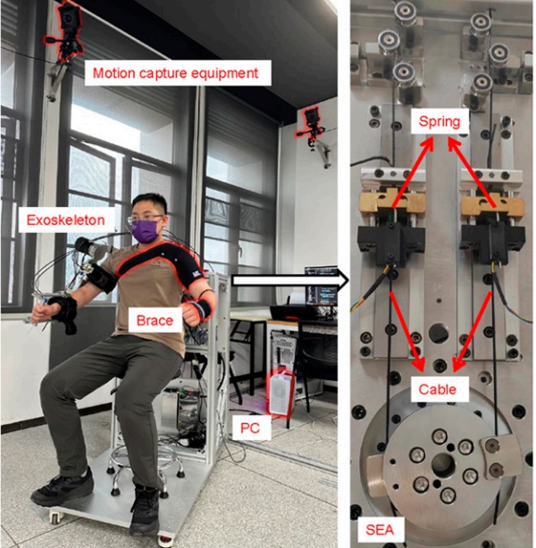 研究团队开发的上肢外骨骼机器人具有 6 个自由度,采用串联弹性驱动器(SEA) 与绳牵引驱动机制,在提供足够辅助力的同时,确保驱动柔顺、安全性高。