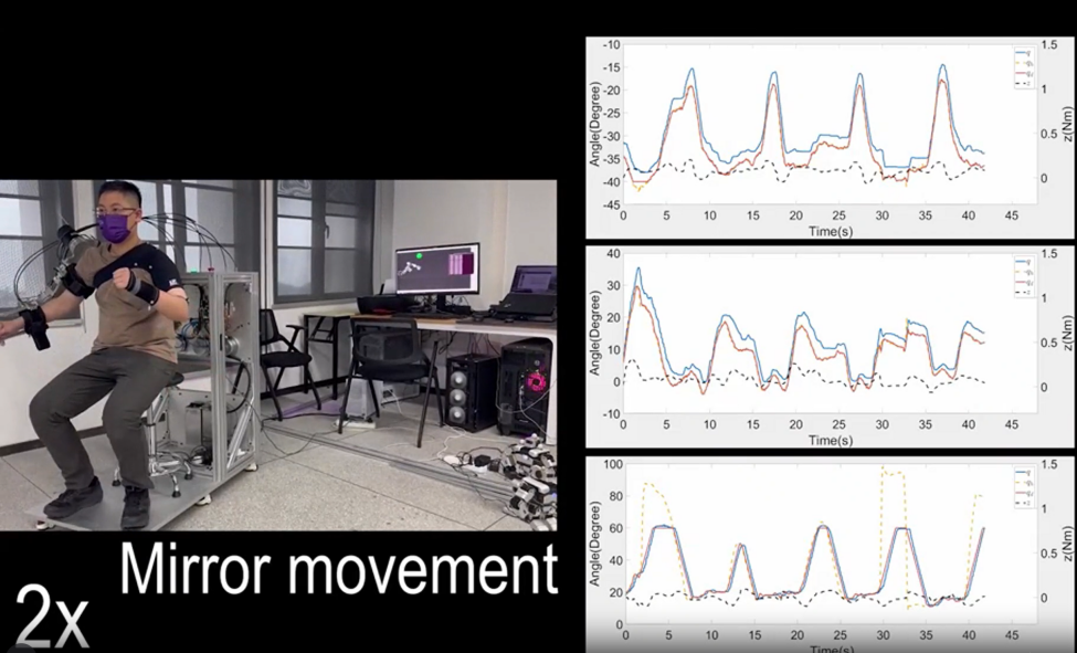 主动镜像训练实验中,患者健康侧自由运动,NOKOV 动作捕捉系统实时捕捉其关节角度,并生成患侧的个性化跟随轨迹。