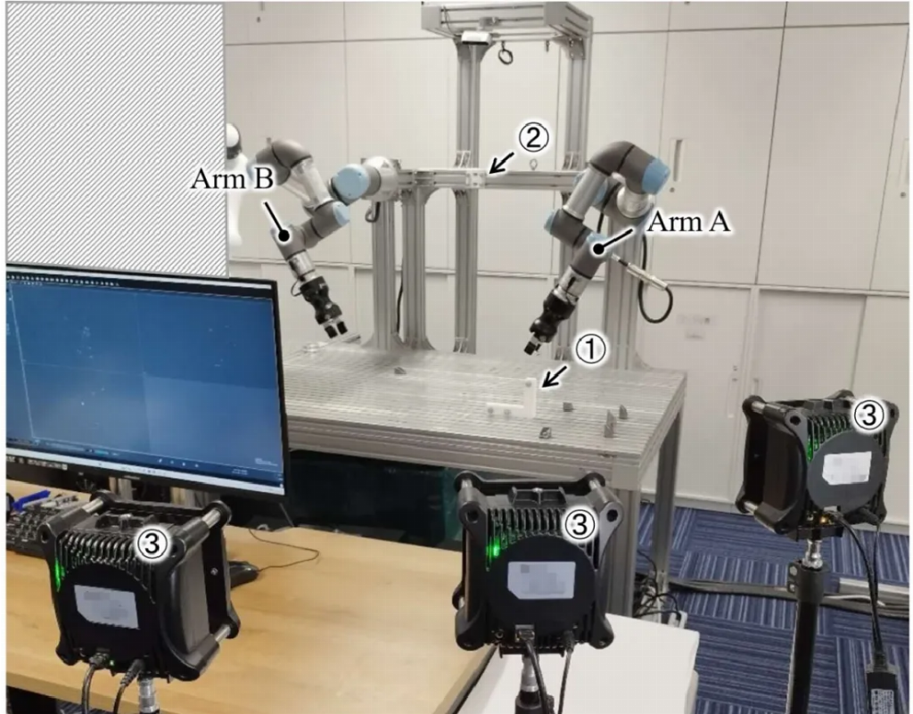 实验中使用的双臂平台。① 带有光学标记的目标物体 ② 用于全局参考的标记 ③用于检测反光标记点的NOKOV度量动作捕捉系统