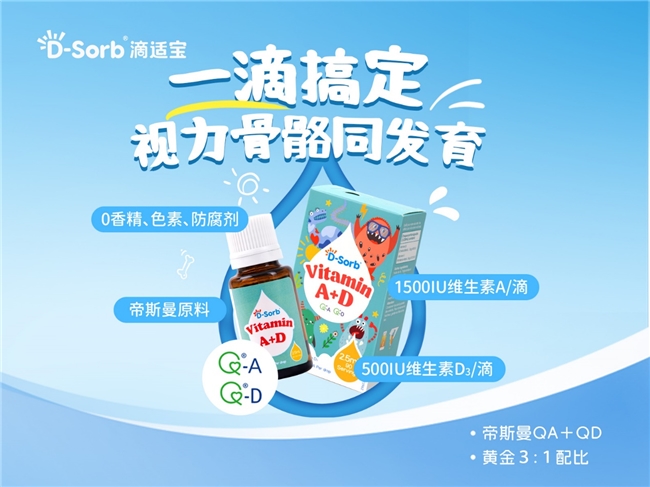 维生素A与维生素D在儿童成长中各有重要作用。滴适宝维生素A+D每滴含有1500IU维生素A和500IU维生素D,采用帝斯曼原料,以双元协同配方为儿童提供营养支持。