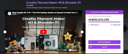 3月31日,创想三维的全新耗材回收系统——Creality Filament Maker M1 & Shredder R1 登录海外众筹平台,上线20分钟破千万、首日突破3000万人民币,一举成为2026全球3D打印类目众筹王者。
