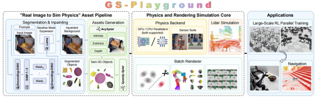 除了“看”得清,还要“造”得快。以往构建一个仿真场景,需要人工耗费大量时间建模、贴图、调整物理属性,这被称为“数字孪生”的最后一公里难题。GS-Playground引入了一条全自动化的“Image-to-Physics”流水线,只需输入一张普通的RGB图片,AI就能在几分钟内自动识别出物体、补全背景、生成三维结构并赋予其物理属性。这种“所见于所得”的能力,极大地降低了具身智能的研发门槛。