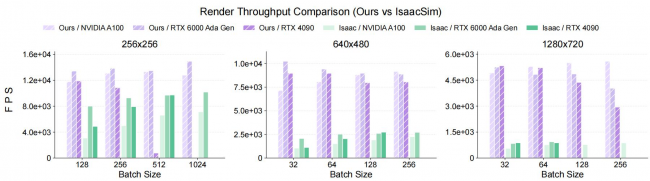 GS-Playground 与 Isaac Sim 光线追踪渲染器在不同分辨率下的渲染吞吐量对比